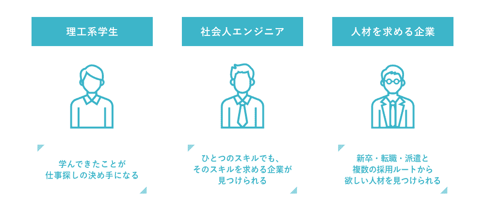 理工系学部で学ぶ学生の方には、機電系エンジニアへの道を諦めないで欲しいという『想い』、すでに経験を持つ社会人エンジニアの方には、そのスキルがつながる転職方法があるということを知ってほしいという『想い』、そして採用の問題を抱えている企業の方には、AIを駆使したスキルマッチングシステムを理解して欲しいという『想い』。