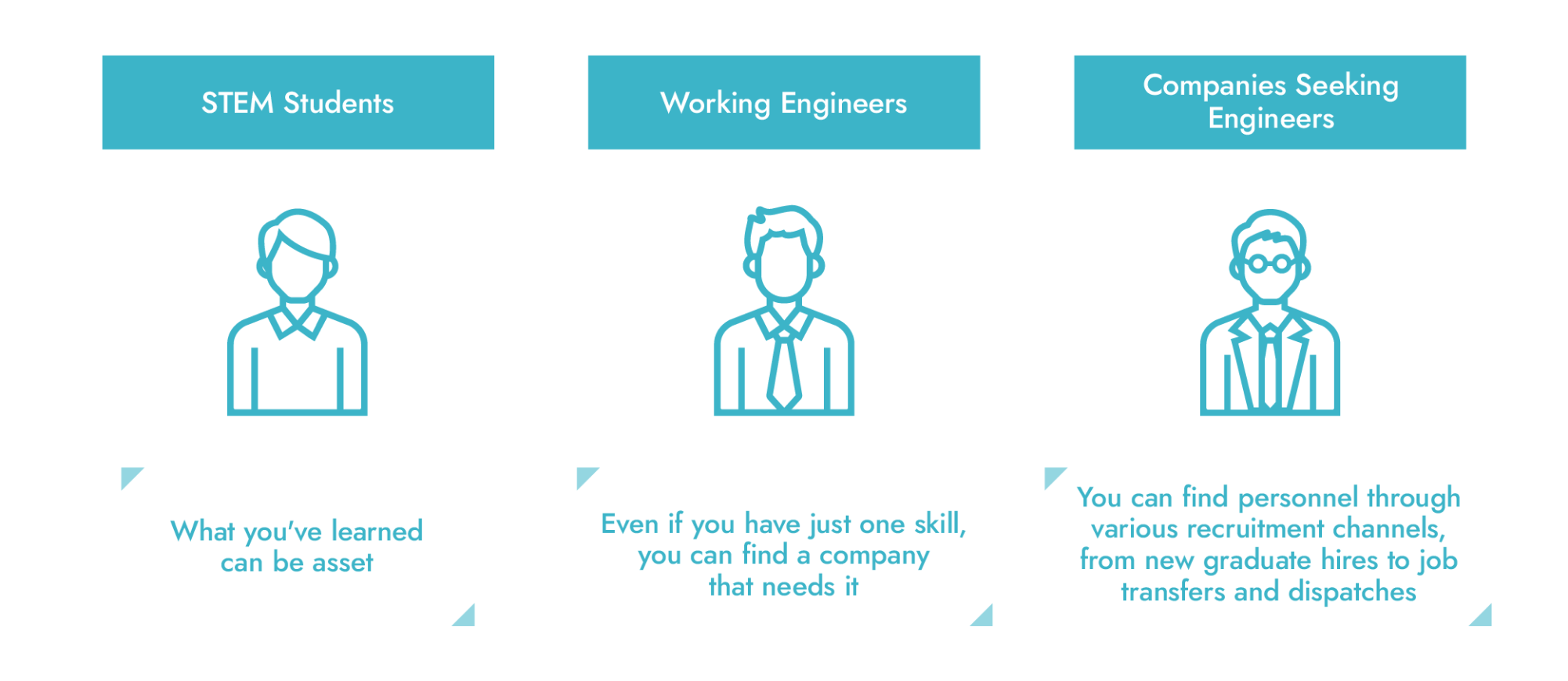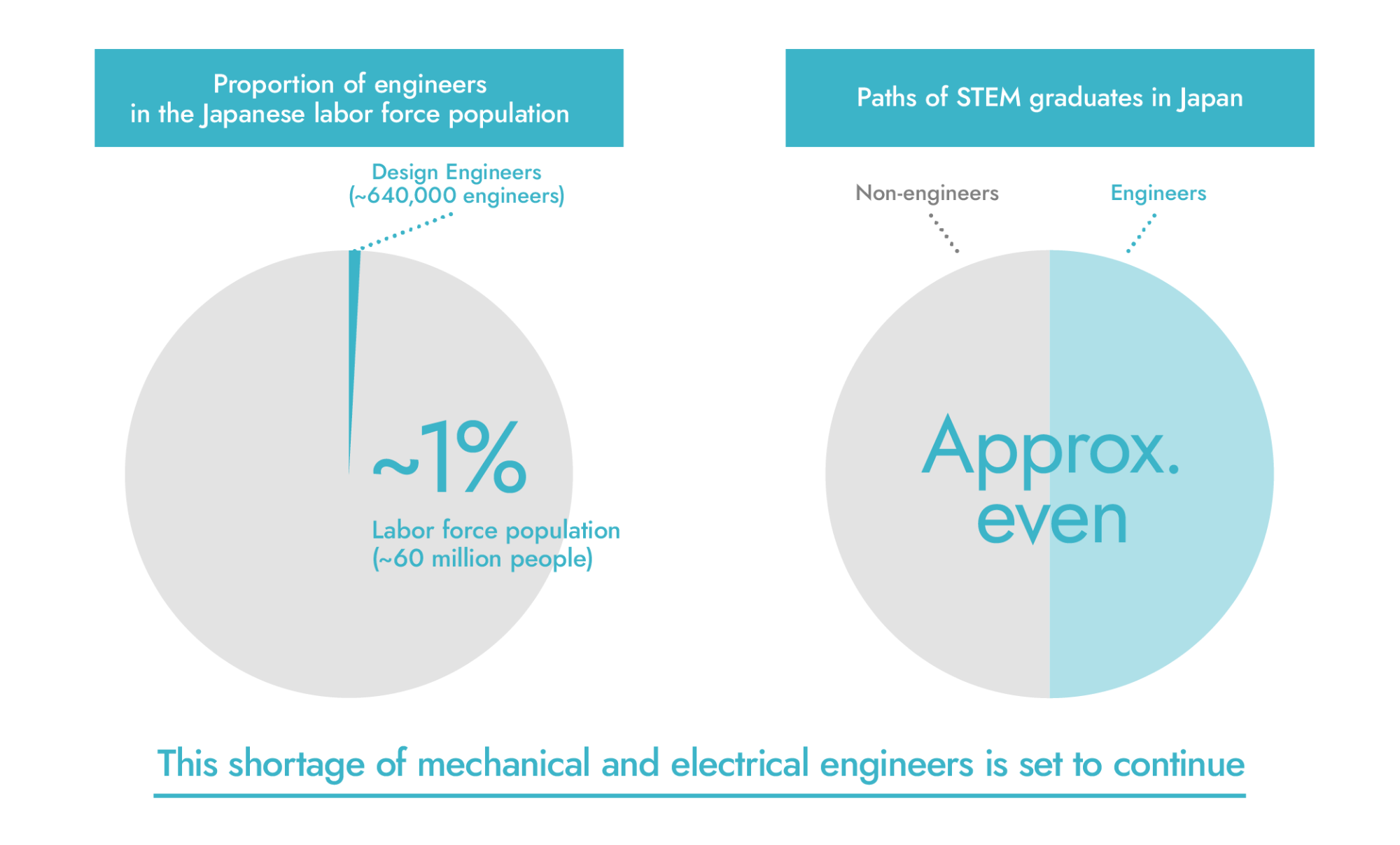 The number of STEM students with a grounding in mechanical and electrical engineering is on a downward trend in Japan, and of the 40,000 or so new graduates each year, approximately half are moving into careers other than engineering. Furthermore, due to the compounding factors of a declining birthrate and retiring second-generation baby boomers, the shortage of mechanical and electrical engineers supporting manufacturing in Japan is set to continue.