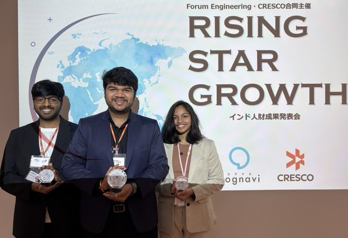 当日はインドのSRM大学AP校とオンラインで中継をつなぎ、日本での就業を目指す約100名の学生が視聴。日本で働く先輩エンジニアの経験や成長を“生の声”として届ける機会となりました。RISING STAR GROWTH AWARDは、半年~1年半の若手インド人エンジニアが、日本で働き始めてからの成長や挑戦を共有する場として企画されたもので、当社およびクレスコに在籍するエンジニアが、入社後の取り組みや技術成果、業務を通じて得た学びを発表しました。